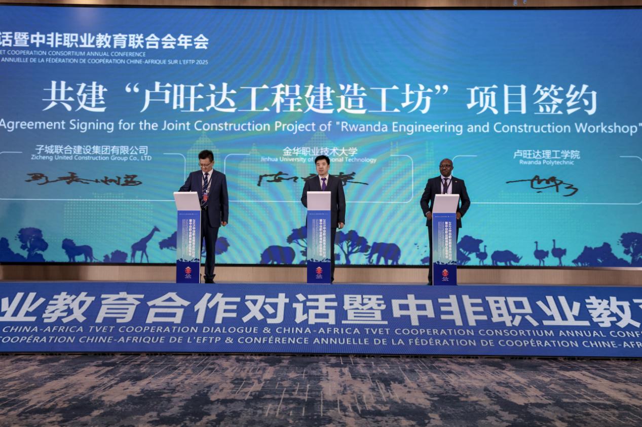 中国教育国际交流协会与中北非国际教育创新联盟进行“来非洲—中非职业教育合作计划”签约,中国教育国际交流协会与中航国际成套设备有限公司进行“‘一带一路’携手共建职业教育”项目签约,金华职业技术大学与卢旺达理工学院、子城联合建设集团有限公司签约共建“旺达工程建造工坊”,金华职业技术大学与卢旺达理工学院、浙江传化日用品有限公司签约共建“日用品智能制造国际联合实验室”,进一步推动中非在职业教育领域的深度合作。会上还发布了《提升中非职教合作水平研究》一书,该书为中非职教合作提供了理论支持。
