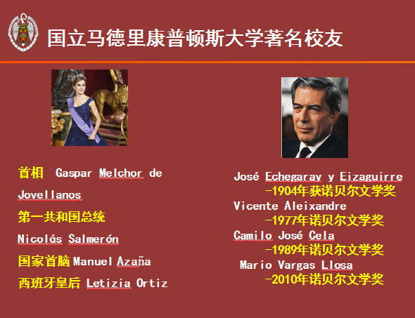 康普顿斯大学是西班牙乃至西语世界最重要的大学,西班牙排名第一, 始建于1293年,是西班牙规模最大,科系最齐全的院校;7位诺贝尔奖获得者、前国王、现西班牙王后、前首相、现副首相及多位政要人士均毕业于该校。