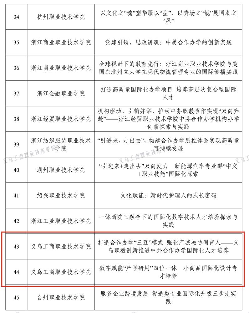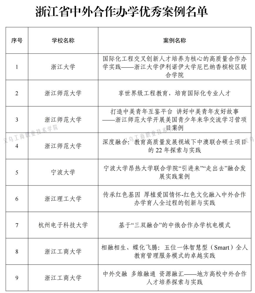 近日,省教育厅开展的中外合作办学优秀案例征集结果揭晓,我校《打造合作办学“三互”模式 强化产城教协同育人——义乌职教创新推进中外合作办学国际化人才培养》及《数字赋能“产学研用”四位一体 小商品国际化设计专才培养》两个案例成功入选。