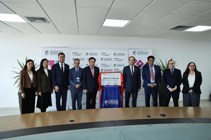 摩洛哥义乌丝路学院揭牌仪式20日在位于摩洛哥卡萨布兰卡的蒙迪亚波利斯大学举行。