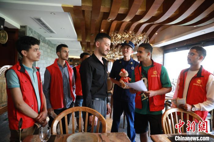 在一家异国风味餐厅,浙江省义乌市消防救援支队消防监督人员与国际消防志愿者一起,仔细检查店内灭火器、消火栓、疏散通道是否符合要求,向食客和餐厅工作人员发放中英双语消防宣传手册。
