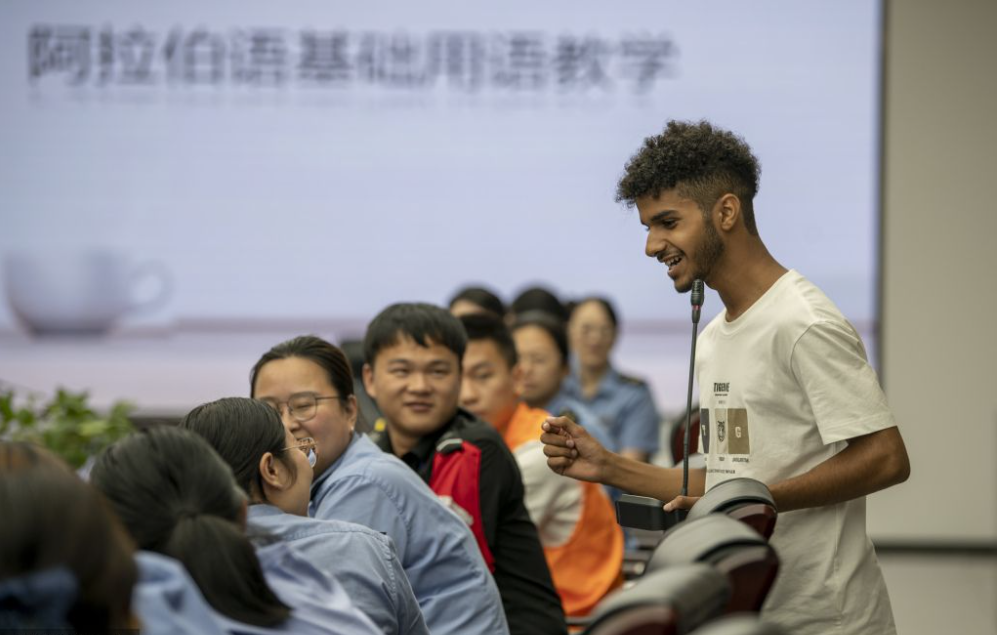 8月29日,浙江金华,义乌站多功能厅内,来自也门的国际学生王迪正在给车站工作人员培训阿拉伯语。