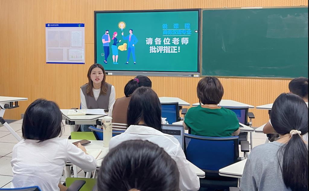 本次“说课程”教研现场,商务汉语方向的课程负责人认真筹备展示课件,围绕各自课程进行了详细介绍,从课程性质与任务、课程目标与要求、课程结构与内容、学生考核与评价、教学实施与保障、课程特色、资源开发以及建设目标等八个方面进行了细致剖析,充分展示了对课程建设的积累与思考。