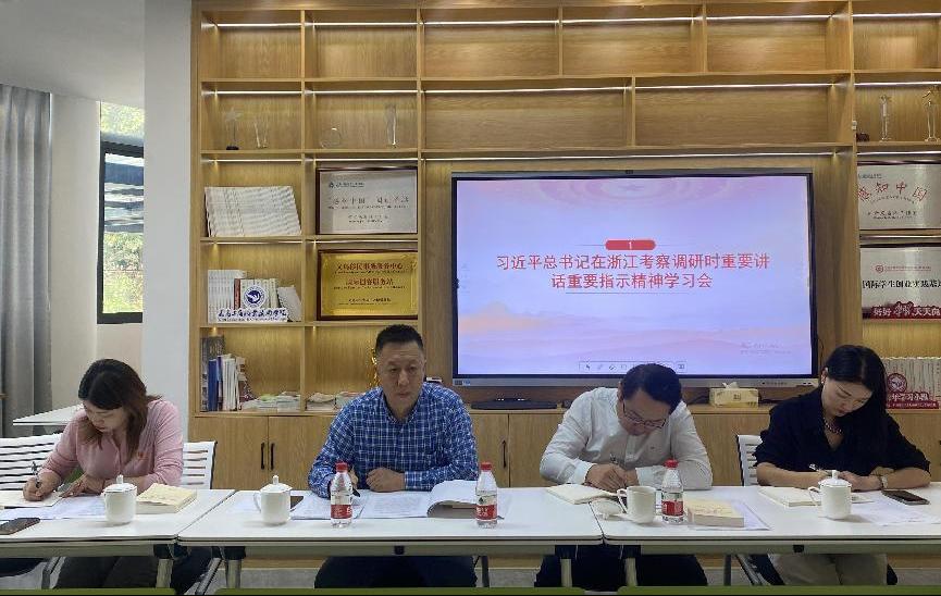 校领导讲党课环节,党委委员、副院长樊曜作了题为《牢记嘱托 勇于担当 合力助推高质量发展》的报告。樊曜分享了习近平总书记的浙江之行,学习了具有代表性的四大经验:李祖村——浙江“千万工程”经验;义乌国际商贸城——义乌发展经验;枫桥经验陈列馆——枫桥精神;浙东运河文化园——大运河文化保护传承利用相关经验做法。传达了习近平对浙江提出的新要求:要在以科技创新塑造发展新优势上走在前列;要在推进共同富裕中先行示范;要在深化改革、扩大开放上续写新篇;要在建设中华民族现代文明上积极探索;要坚持和加强党的全面领导、加强和改进党的建设。樊院长强调,全体教师要时刻牢记习近平总书记的殷殷嘱托,以义乌区域发展为依托,以义乌发展经验为遵循,紧密校企联系,攻坚克难,奋起直追,进一步提高服务地方发展能力。