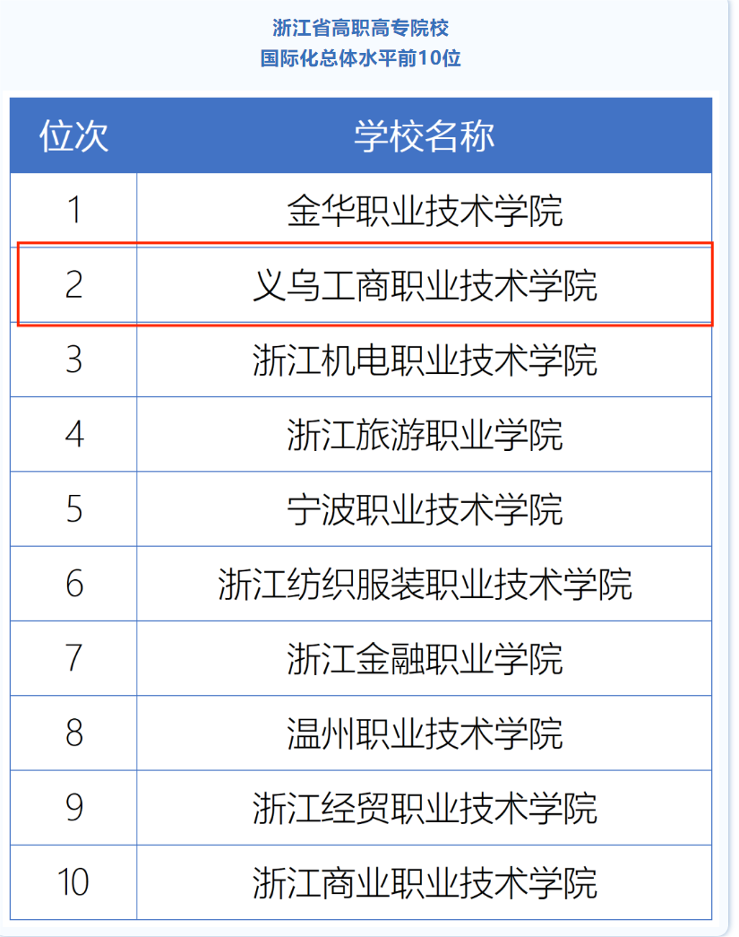 近日,浙江大学高等教育研究所正式发布《浙江省高等教育国际化年报(2022)》,调查了我省102所高校2022年国际化发展情况,并通过对高校人才培养国际化、师资队伍国际化、国际合作研究、国际交流、产学研合作、服务“一带一路”建设、国际化支撑保障等情况全面梳理分析,按照硕博授权高校、其他本科院校、高职高专院校、独立学院等4个类别对102所高校国际化水平进行了排序。我校荣登浙江省高职高专院校国际化总体水平排行榜第二名,这也是继2018年和2019年两度进入该榜单前三强后,我校在国际化水平上的又一次提升。