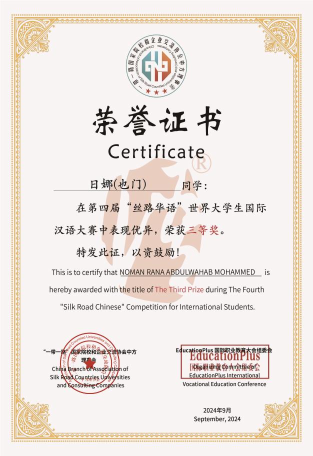 近日,第四届“丝路华语”世界大学生国际汉语大赛结果公布,我院21商务汉语班阿布达拉(马里)获得一等奖,22商务汉语班日娜(也门)获得三等奖,塔克尔(哈萨克斯坦)获得优秀奖。