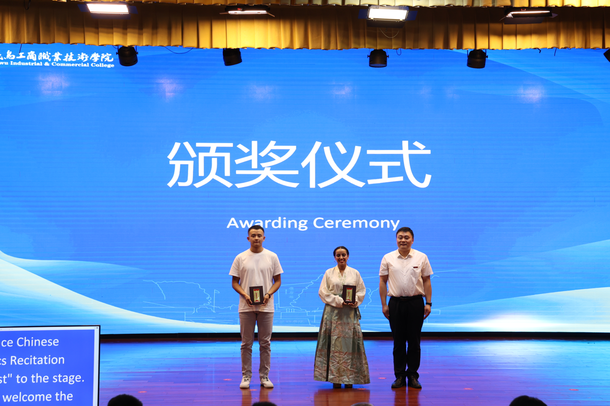 浙江省第十一届中华经典诵读大赛获奖选手阿布达拉、日娜、塔克尔为现场师生送上了诗朗诵表演《致橡树》《中文有多美》《努力树》节目。