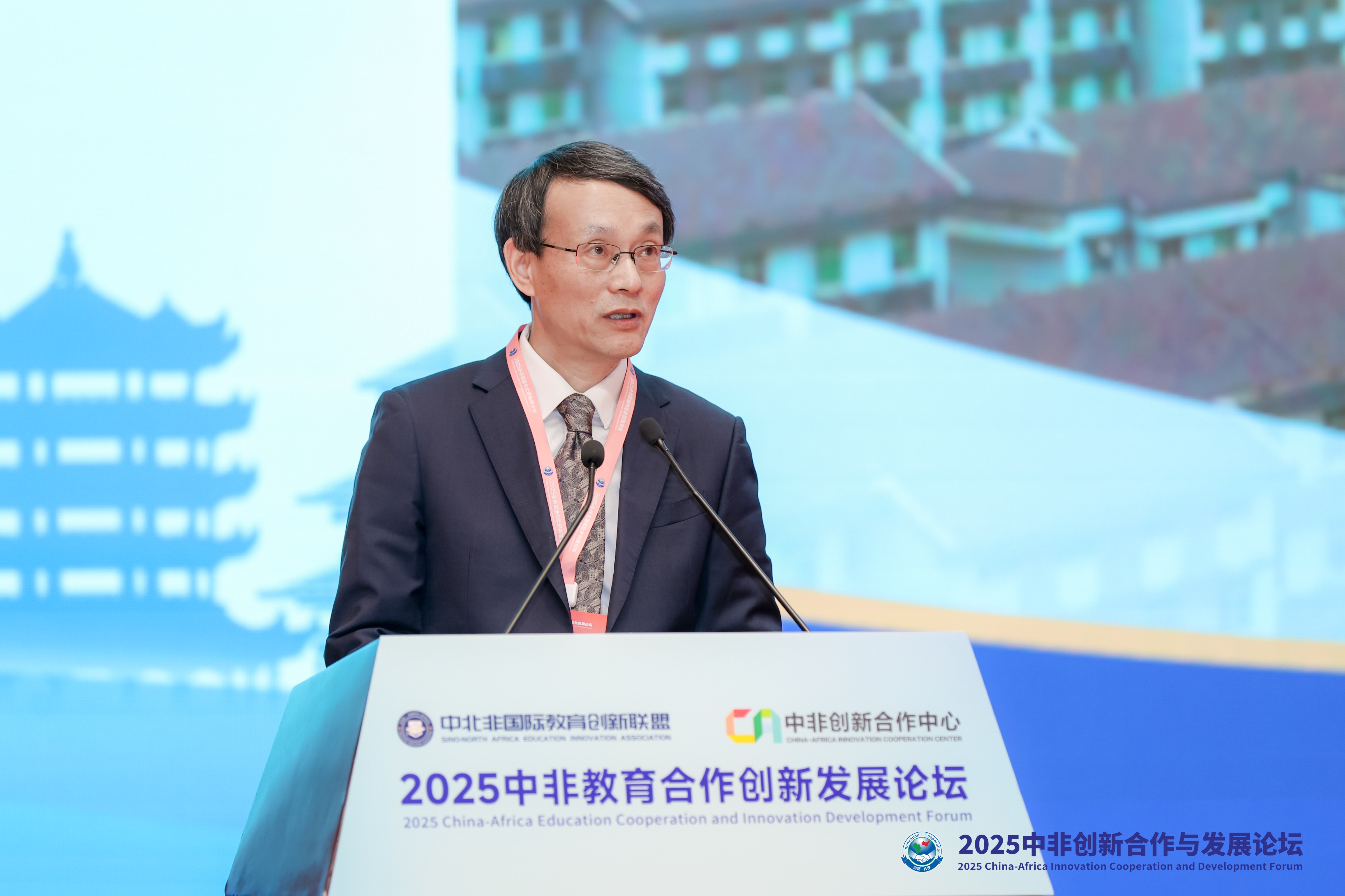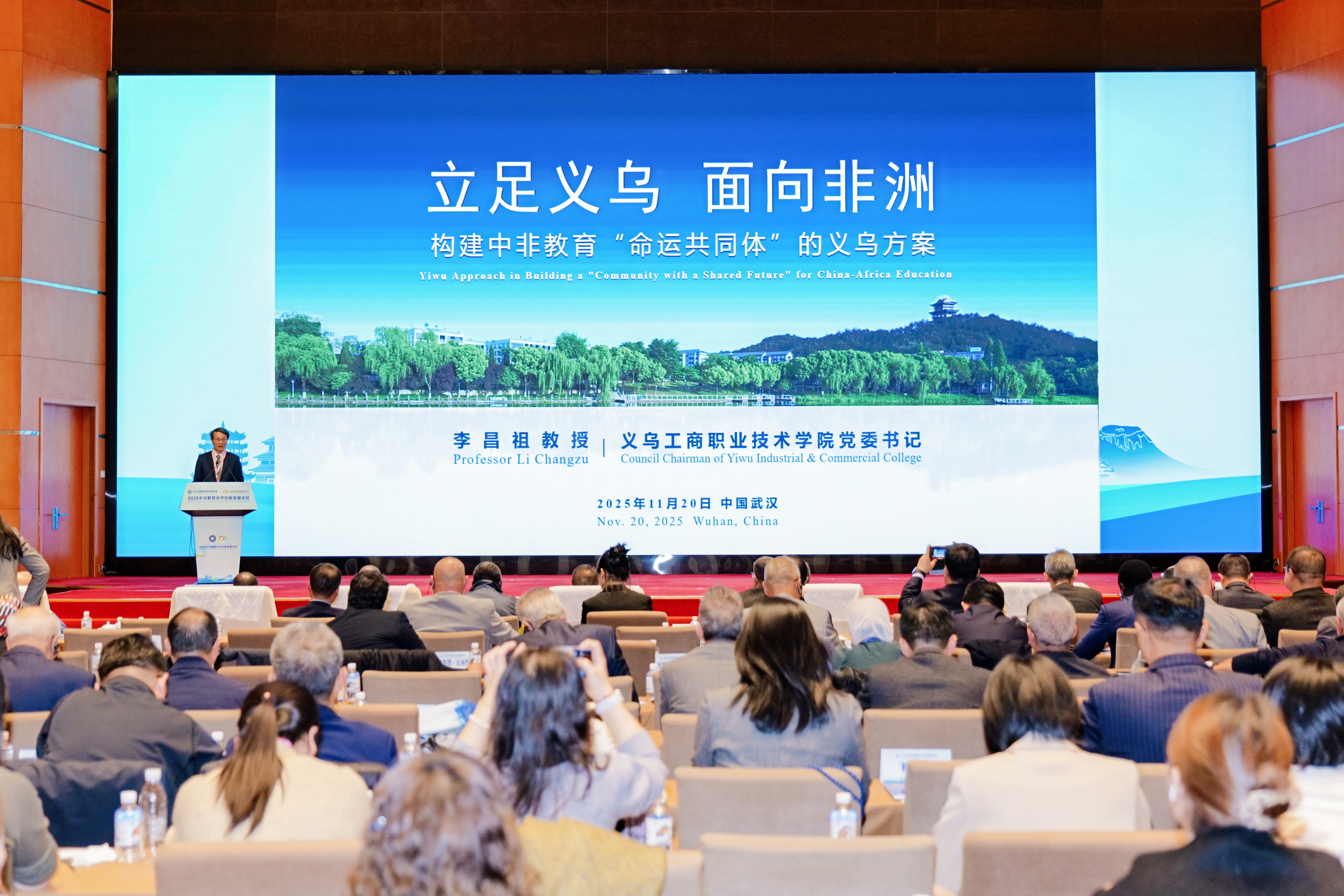 11月19日-22日,由科技部与湖北省人民政府主办的“2025中非创新合作与发展论坛”在湖北省武汉市举行。“2025中非教育合作创新发展论坛”作为主论坛平行专场活动同期举行,该论坛由中非创新合作中心、中北非国际教育创新联盟主办,我校联合承办。来自摩洛哥、突尼斯、埃及、阿尔及利亚、布基纳法索等11个国家的政要、大使及各领域学者50多人以及国内15个省份的职业院校与企事业单位代表近280人参会。湖北省科技厅党组成员、副厅长夏松,联合国教科文组织驻非盟联络处主任丽塔·比松诺斯,教育部职业教育发展中心办公室主任黄洋等出席论坛并致辞。党委书记李昌祖教授受邀在论坛上作题为《立足义乌 面向非洲 构建中非教育“命运共同体”的义乌方案》的主旨报告。