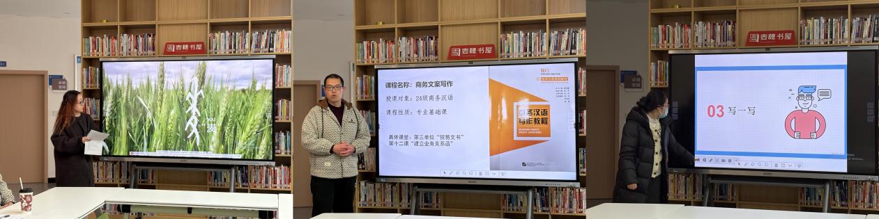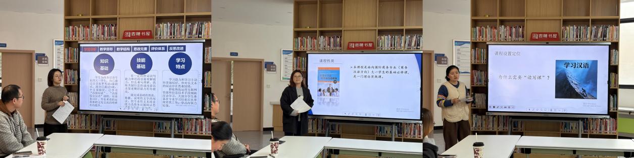 在“义职四说”环节中,“说课程”与“说课堂”两个部分的展示亮点纷呈,充分展现了我院教师的教学创新与专业思考。“说课程”环节,《中级商务汉语阅读》《商务汉语听说》等课程主讲教师们围绕课程体系建设、教学模式创新、思政融合路径以及评价体系重构等关键议题展开阐述,交流课程在商务汉语人才培养中的目标定位与实施路径。课程分别构建“精读+泛读”的递进式教学结构、结合“三位一体”课内模式与“双课双线”课外延伸体系,充分展现了课程设计的系统性与教学实践的前沿性。“说课堂”环节,语言班《初级读写》等课程主讲教师以读写课为例,深入展示了基于AI技术的语块教学模式,通过“课前诊断-课中内化-课后拓展”三阶教学强化语块教学与书写规范。“四说”教研展示后,与会教师围绕资源使用、学情应对、课程设计、科研发展等方面进行了积极交流。