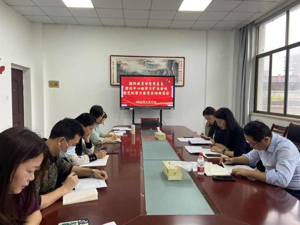 4月17日上午,国际教育学院党总支召开第四次理论学习中心组扩大会议暨党纪学习教育工作部署会,学院领导班子、党总支委员、全体行政人员参加会议,会议由国际教育学院党总支负责人主持。
